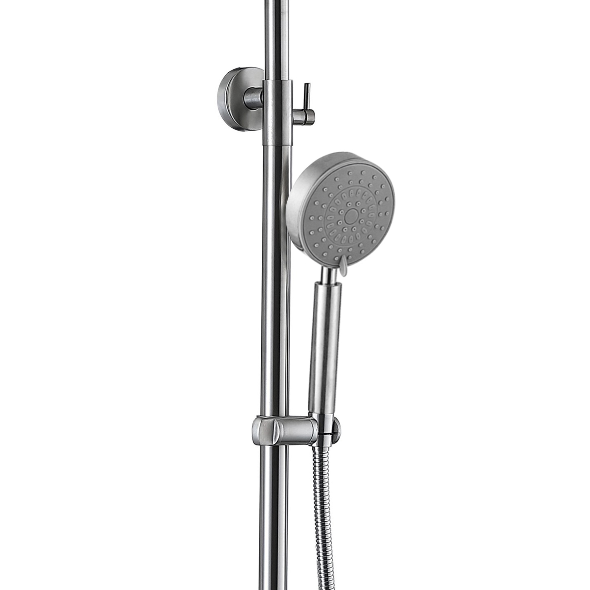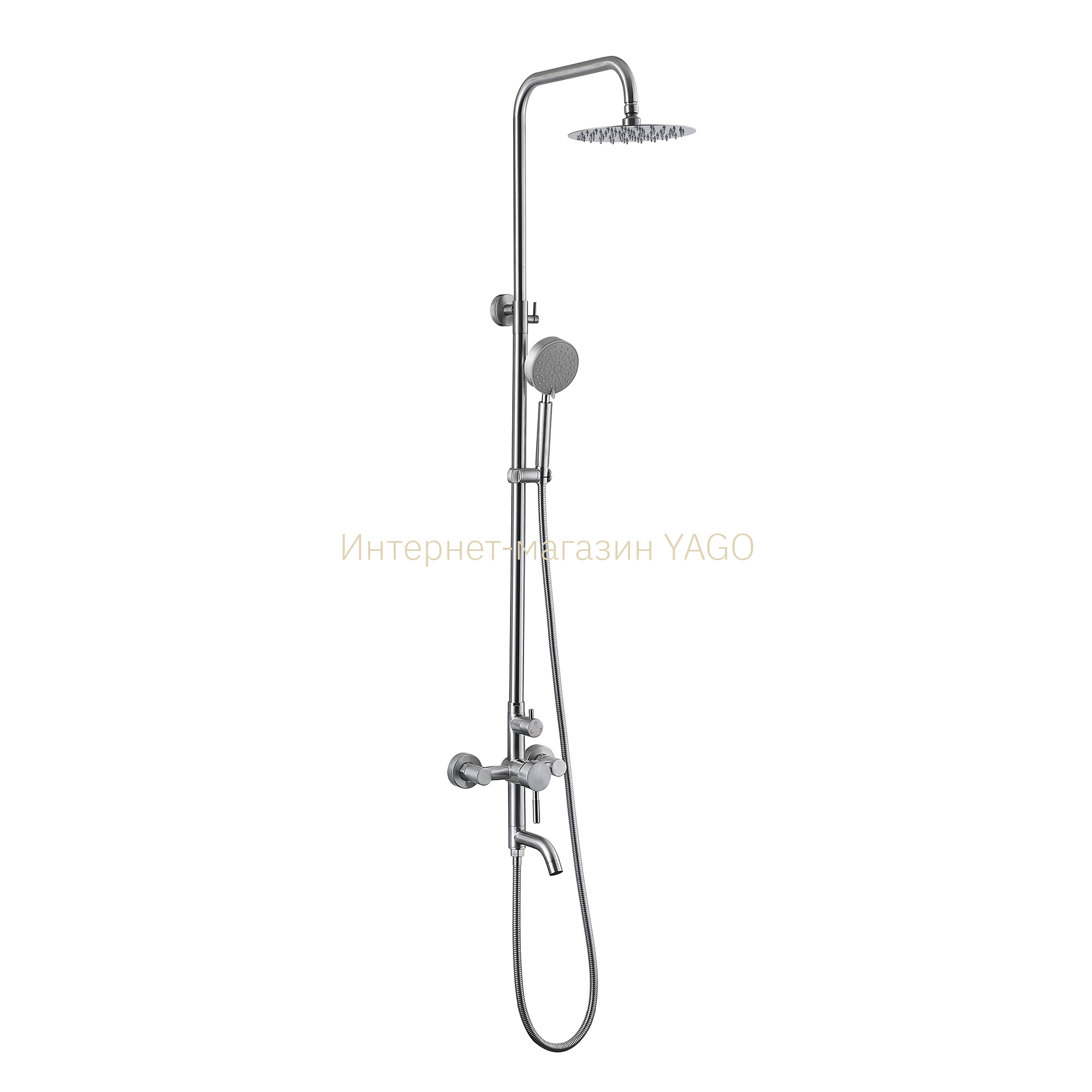 Змішувач, кронштейн для верхнього душу, лійка для верхнього душу, кронштейн для ручного душу, лійка для ручного душу, душовий шланг, душова стійка, кріплення. |