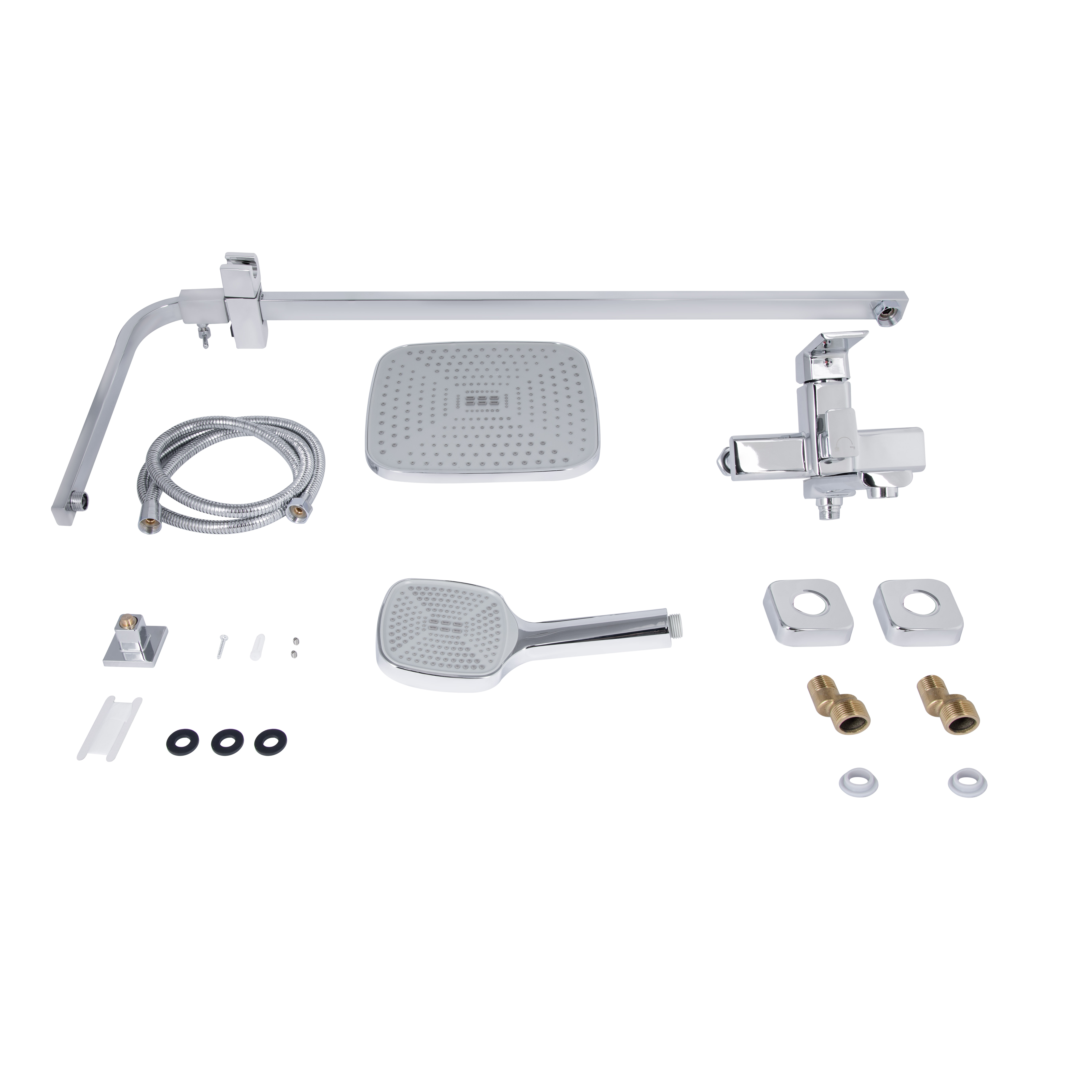 Змішувач, кронштейн для верхнього душу, лійка для верхнього душу, кронштейн для ручного душу, лійка для ручного душу, душовий шланг, душова стійка, кріплення. |