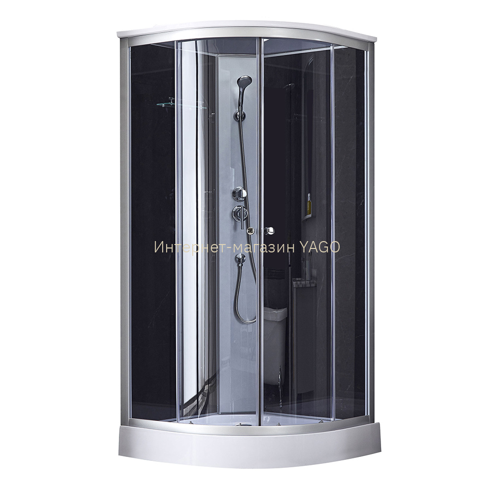 Піддон, сифон, двері, ручки, ролики, профіль, комплект кріпильних деталей, задня стінка, панель, змішувач, лійка для ручного душа, лійка для верхнього душа, душової шланг, кронштейн, ніжки, верхня кришка, скляна полиця. |