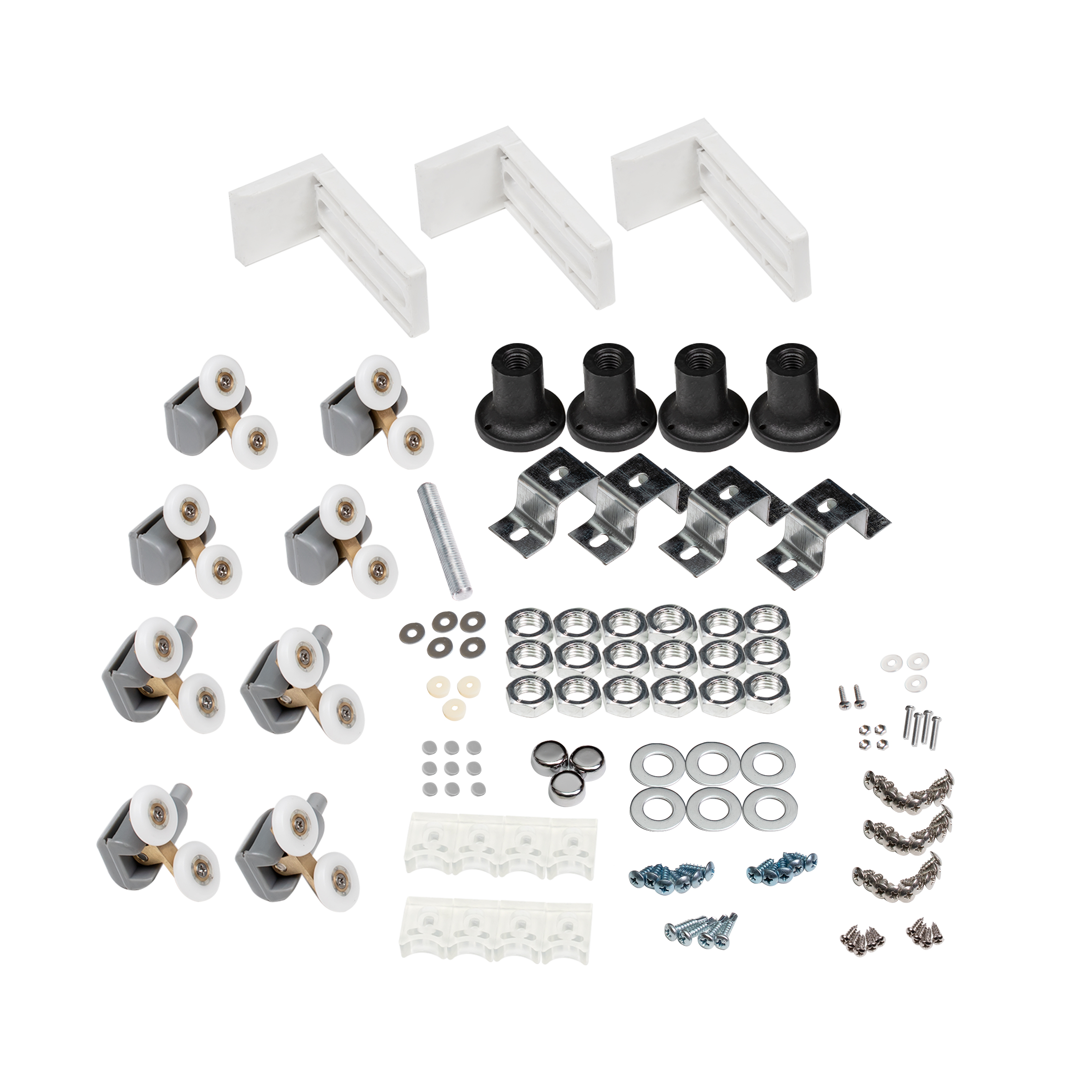 Піддон, сифон, двері, подвійні ролики, ручки, профіль, комплект кріпильних деталей, задня стінка, глухе скло, скляні двері, панель, змішувач, лійка для ручного душа, лійка для верхнього душа, душовий шланг, кронштейн, верхня кришка, скляна полиця, перехідник 32/50 мм. |