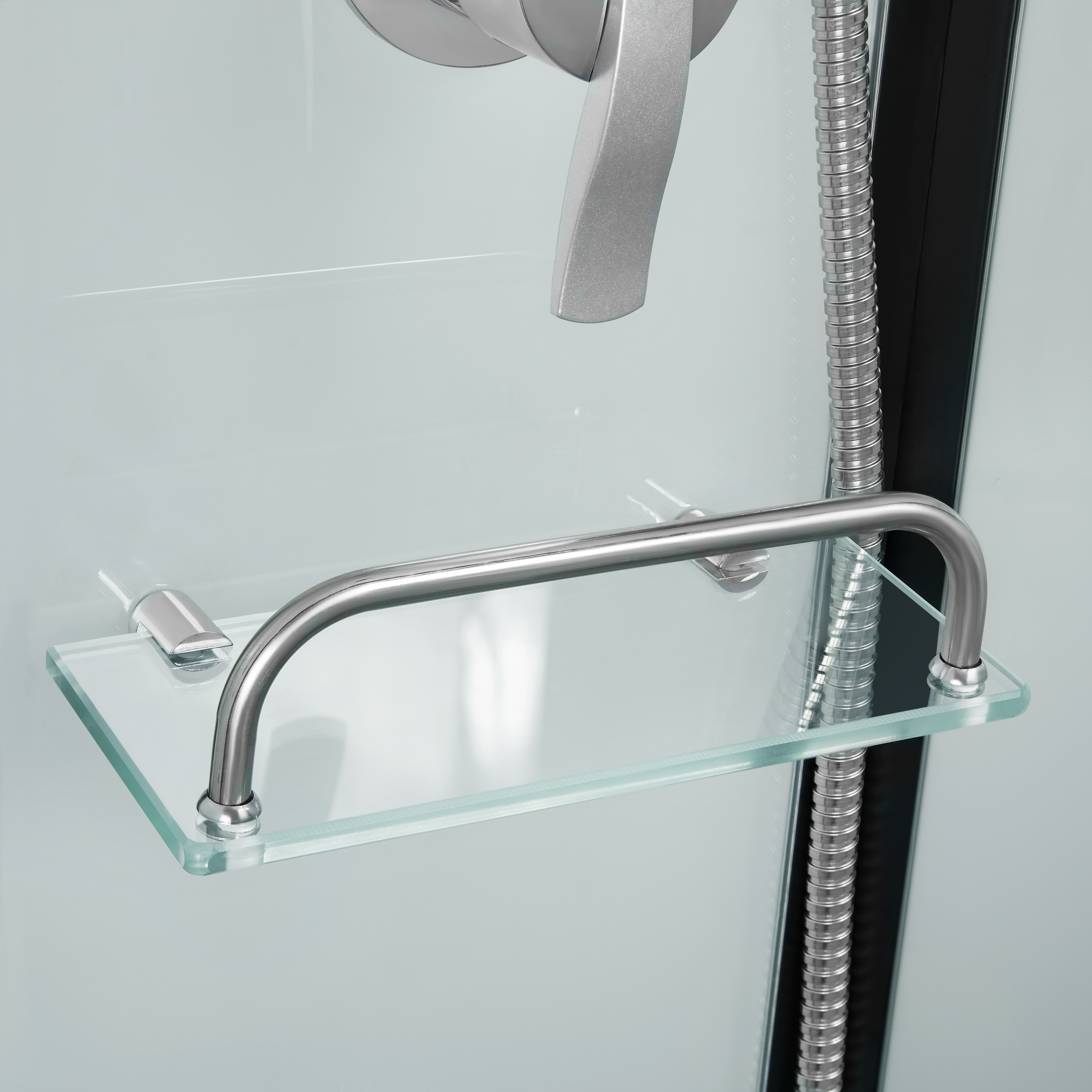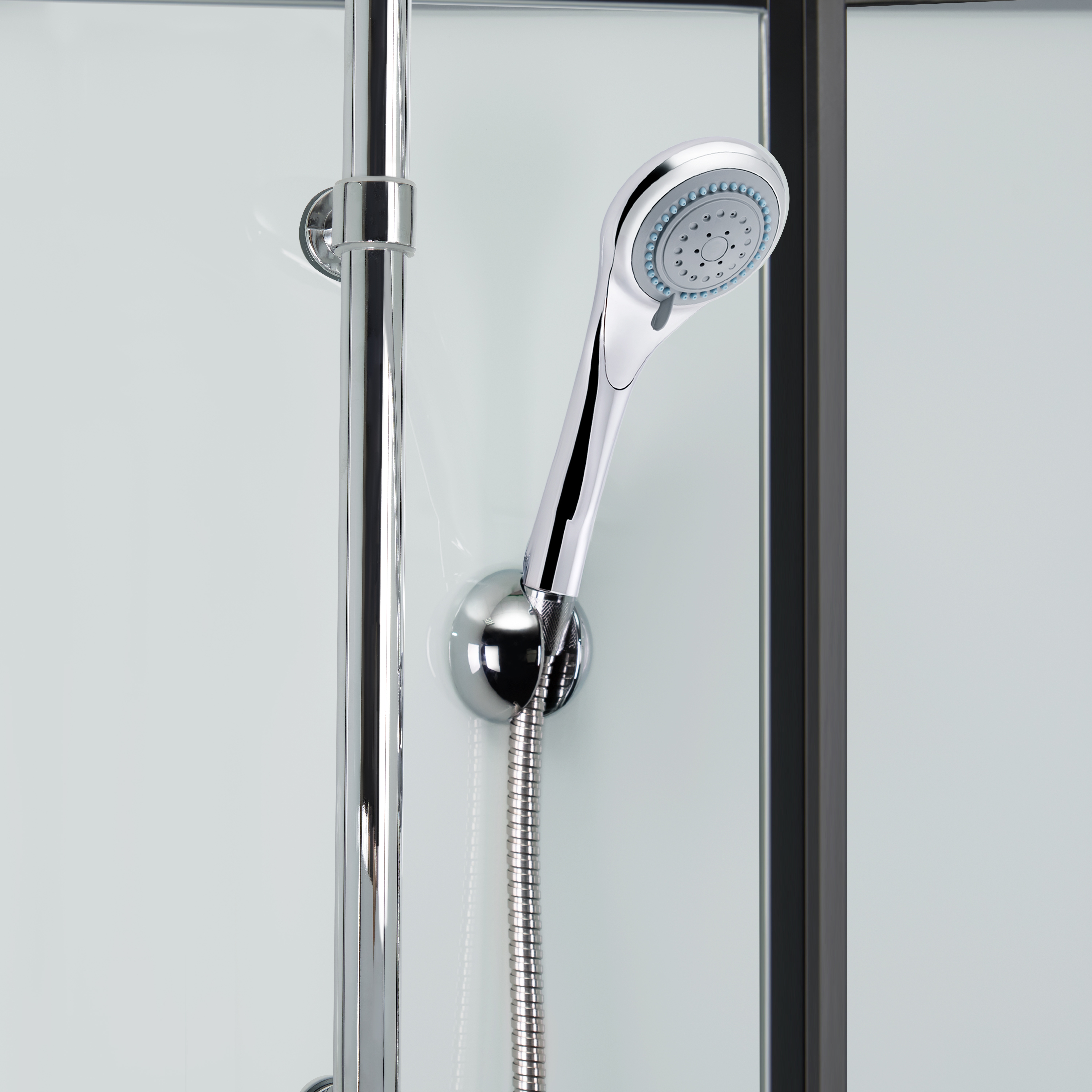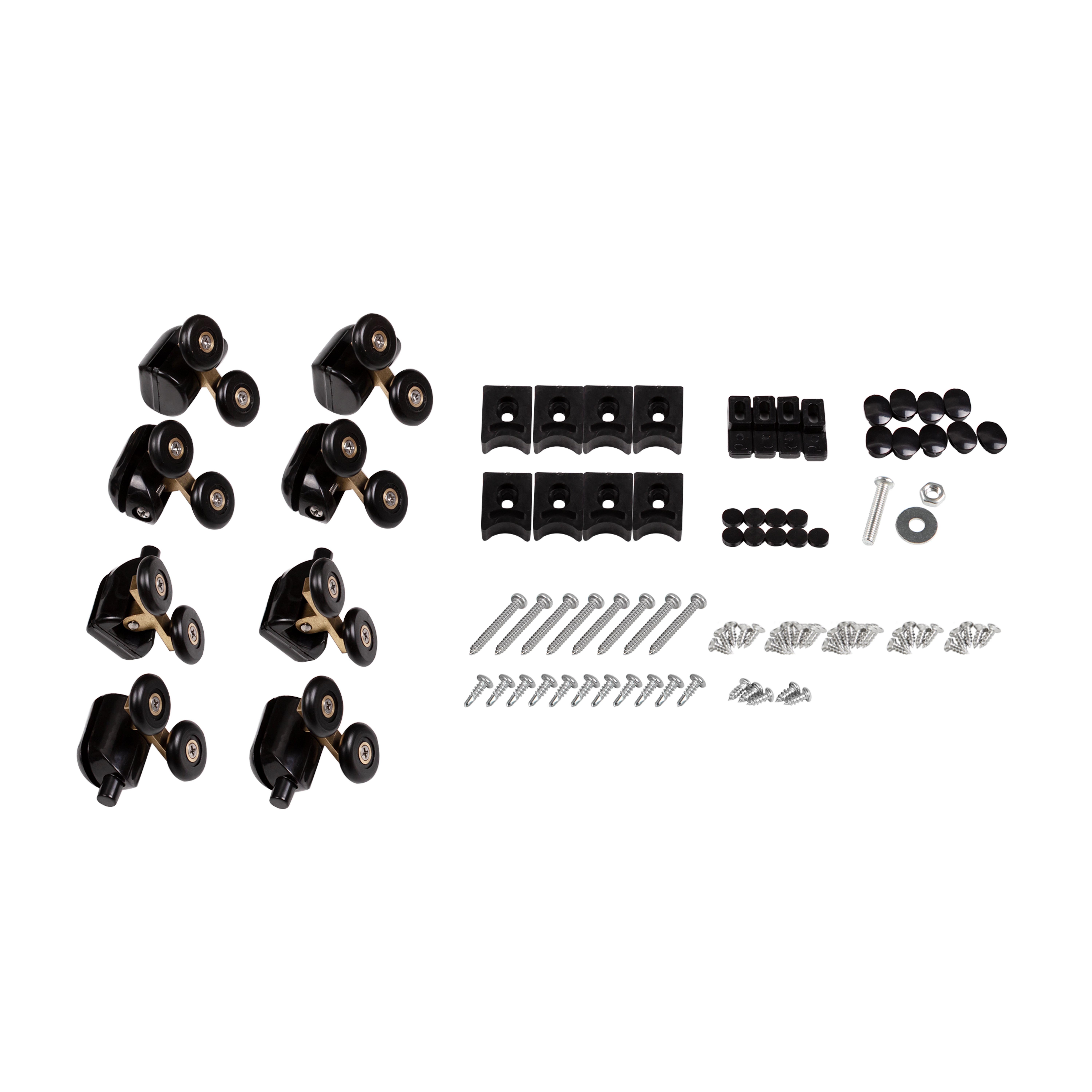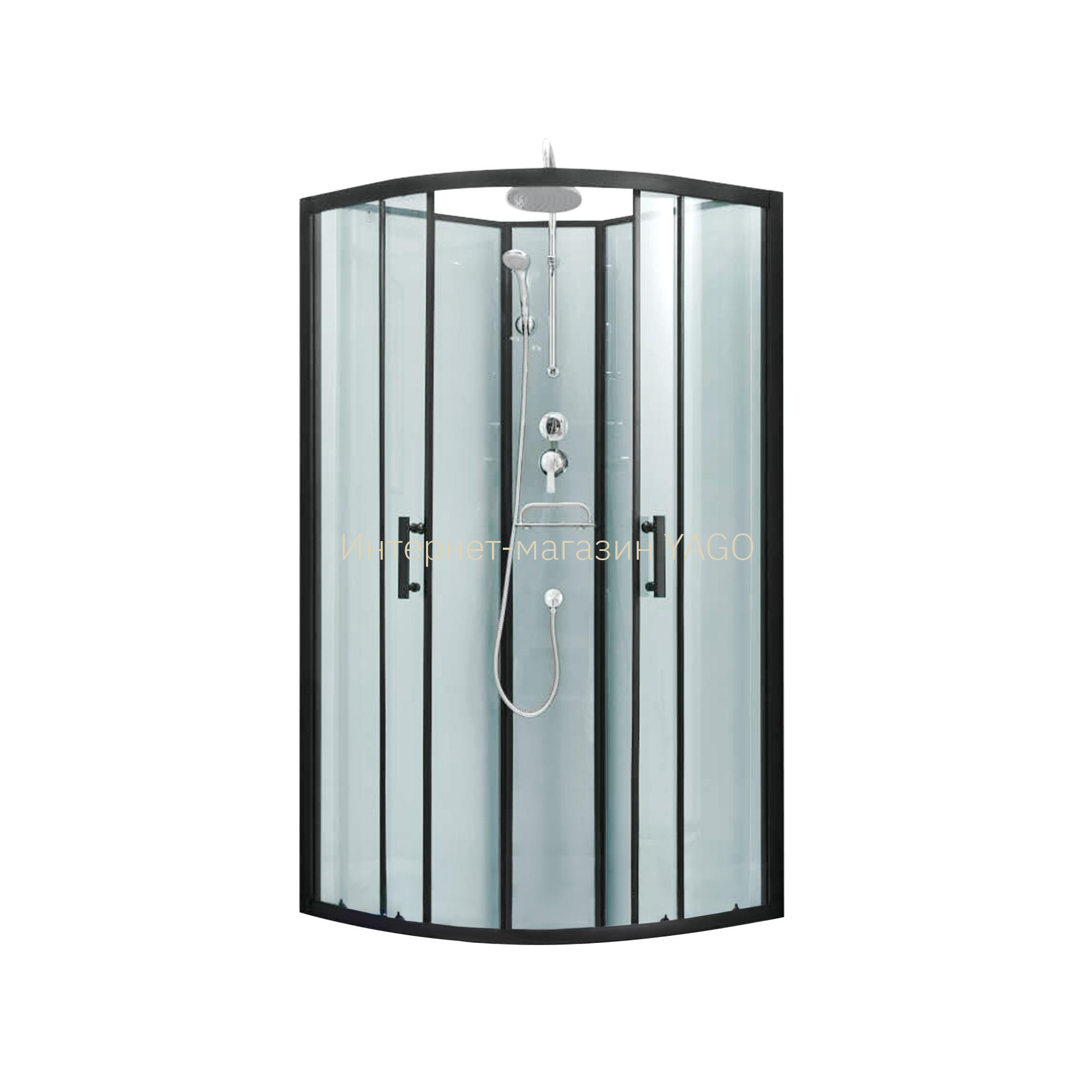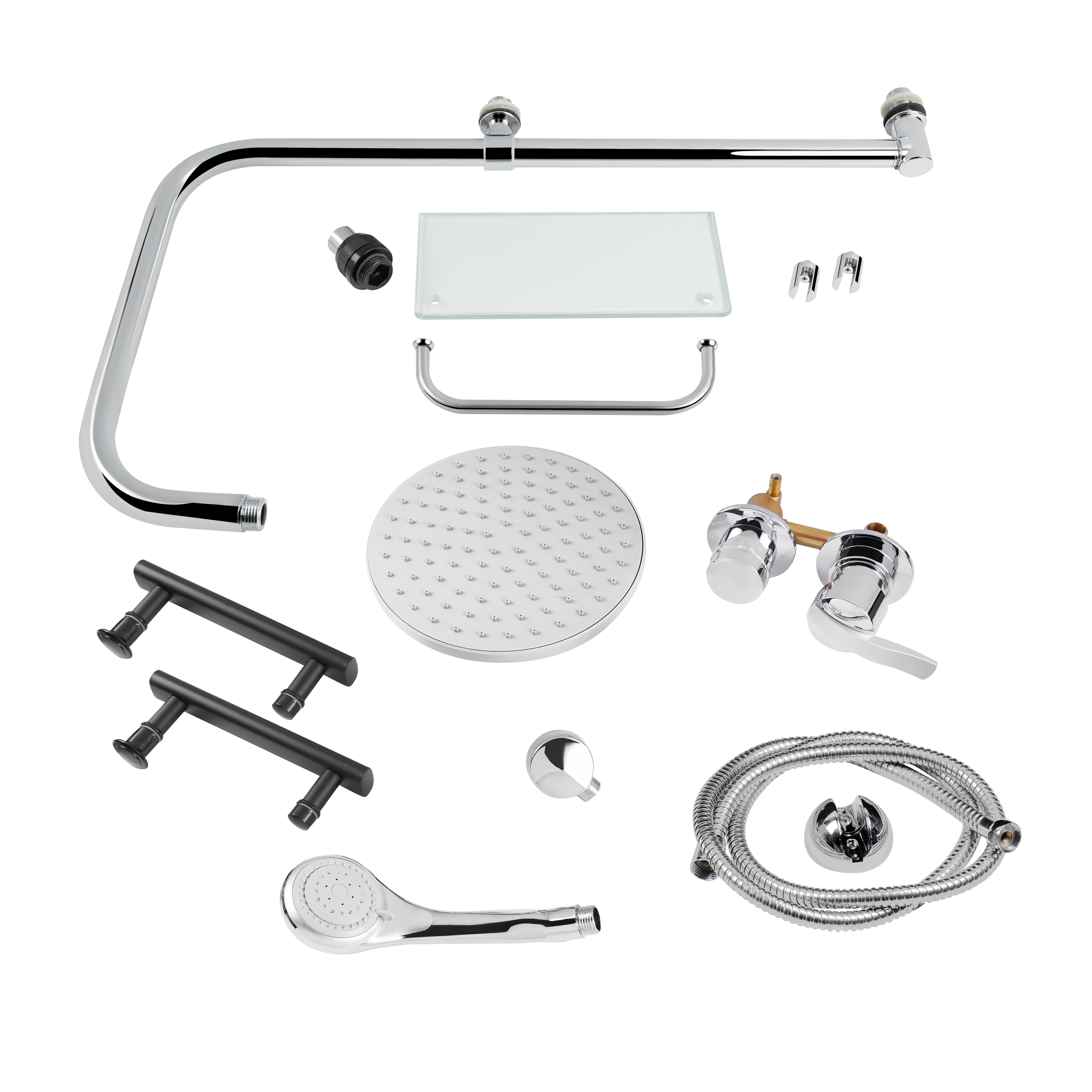 Подвійні ролики, ручки, профіль, комплект кріплень, задня стінка, глухе скло, скляні двері, душова панель, змішувач, лійка для ручного душу, лійка для верхнього душу, душовий шланг, кронштейн, скляна полиця. |