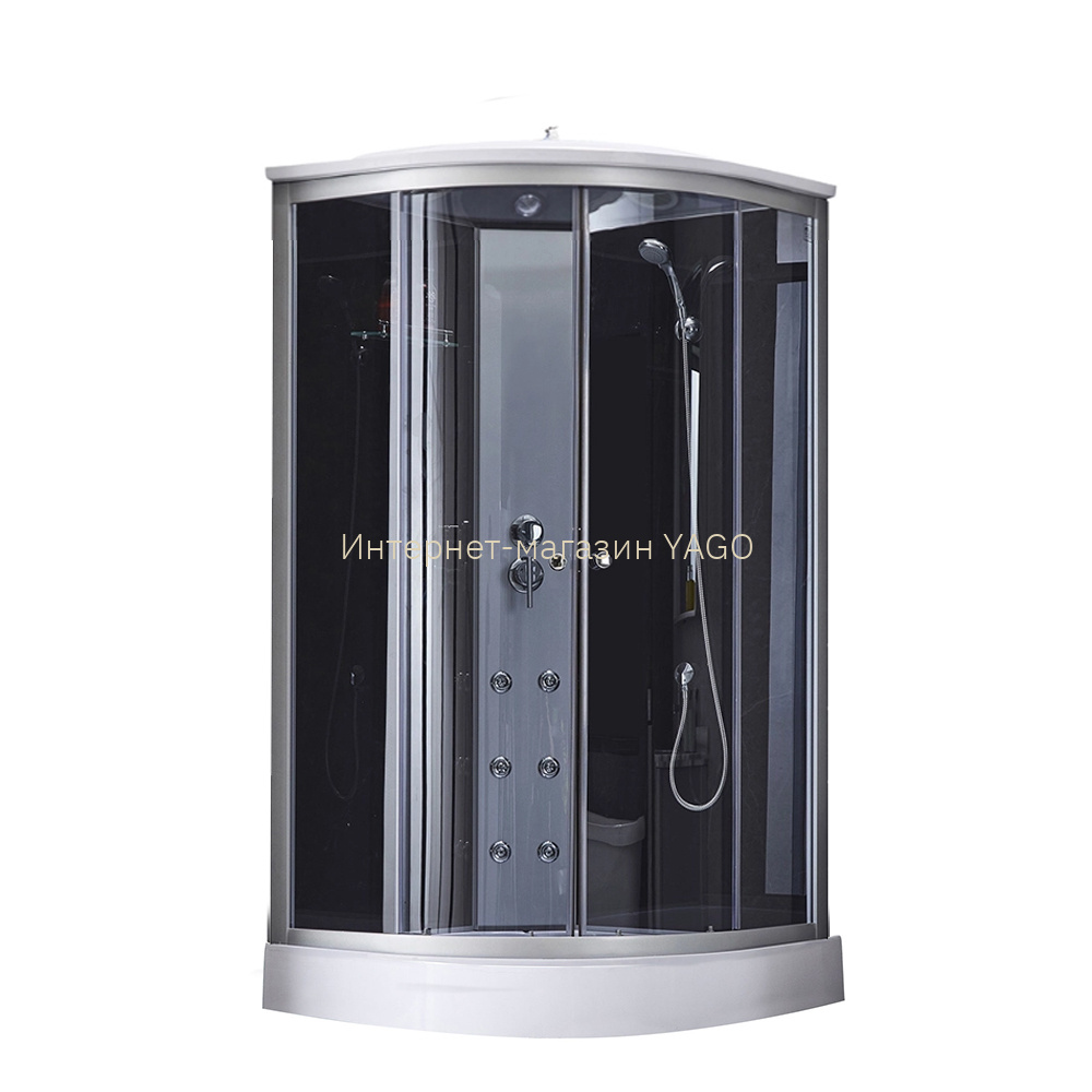 Піддон, сифон, двері, ручки, ролики, профіль, комплект кріплень, задня стінка, панель, змішувач, лійка для ручного душу, лійка для верхнього душу, душовий шланг, кронштейн, ніжки, верхня кришка, скляна полиця. |