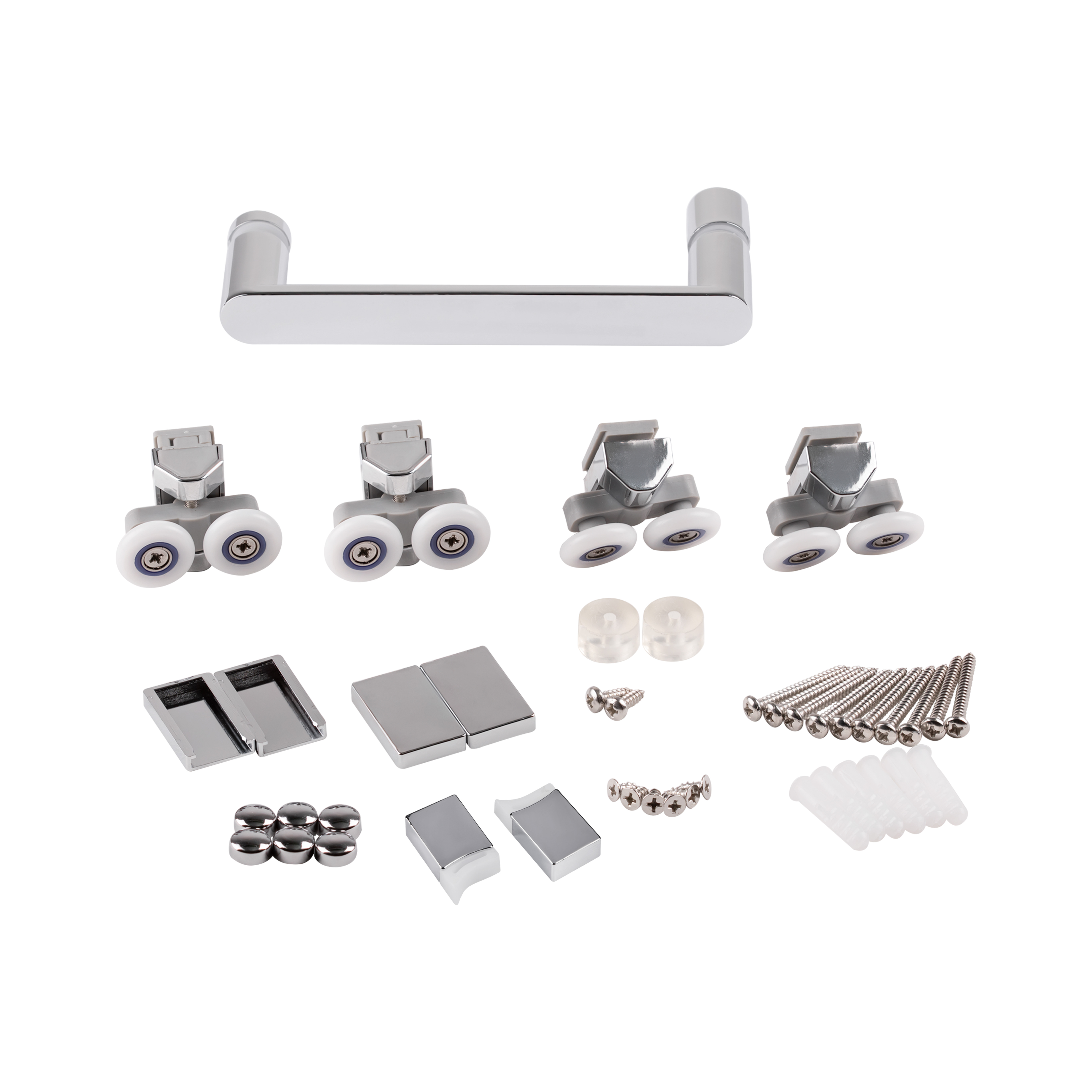 Глухе скло, скляні двері, розширювальні профілі, верхній профіль, нижній профіль, ручка, подвійні ролики, комплект кріплень, набір ущільнювачів, заглушки. |
